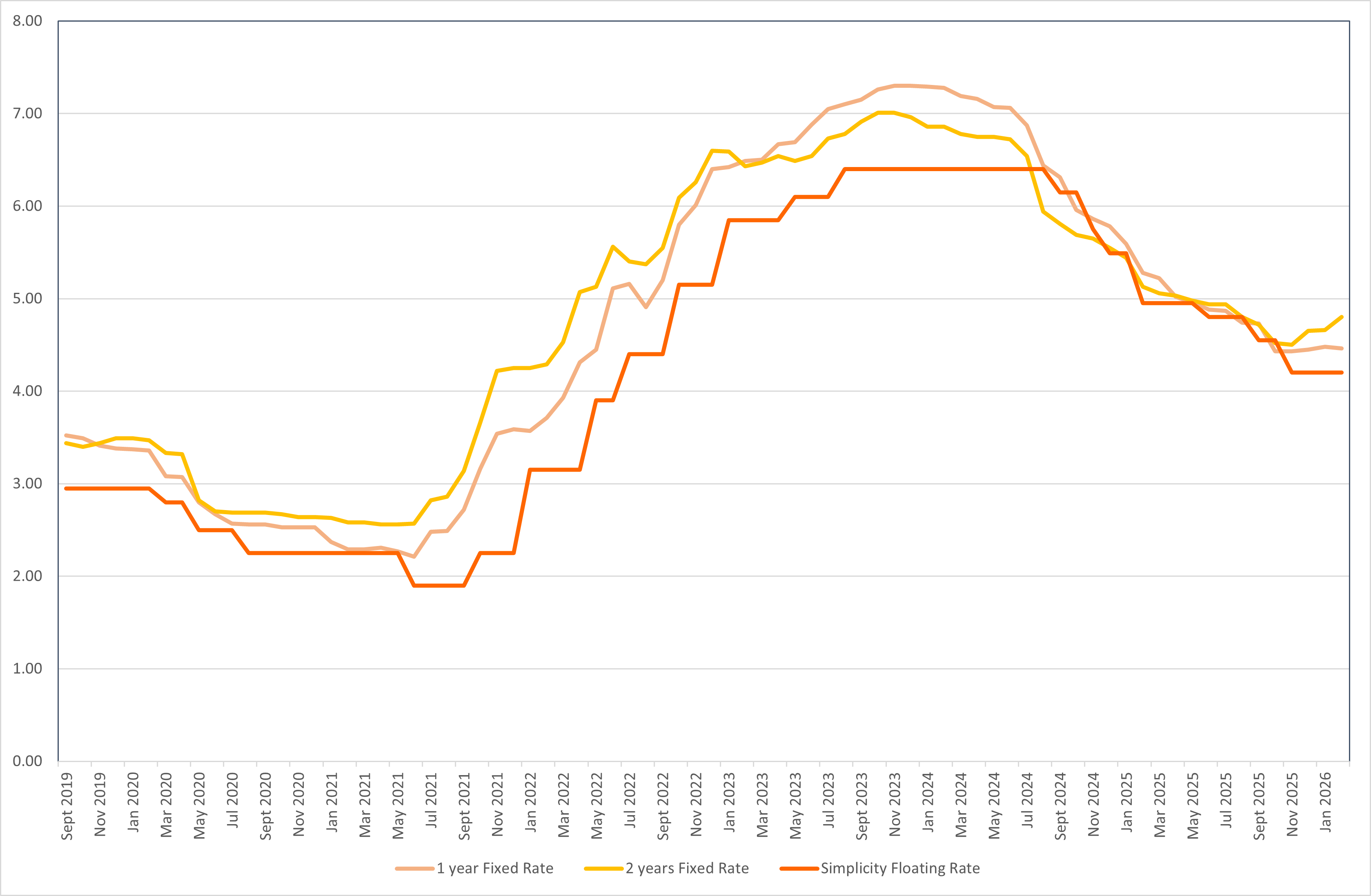 Average market mortgage rates are sourced from the Reserve Bank of New Zealand New residential mortgage special interest rates (B21) as at 28 February 2026. This data series does not include market floating rates but is considered to be the most comparable rates to the Simplicity’s floating mortgage rate.