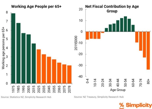 Figure 1: Working age people per retiree. NZ's current fiscal promises (public services & tax settings) need around 5 working age people per retiree. But we are aging fast, and we don't have enough working age people already. It will become harder unless we make gradual changes from now.